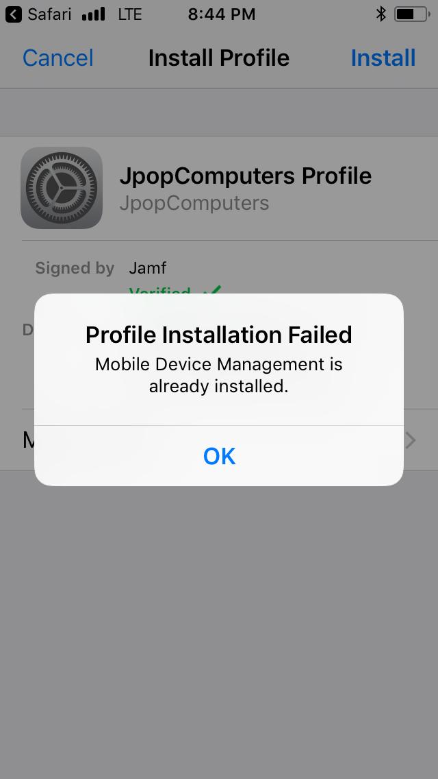 Regardless, even if the DNC did some lightweight management with JAMF Now, let’s say an attacker sends a phishing email with a malicious link to someone to try to take “control” or “management” of his/her device. Even if the end user fell for that email and was prompted for his/her iOS passcode lock to install this management profile, it would FAIL. iOS would report back that “Profile Installation Failed. Mobile Device Management is already installed.”