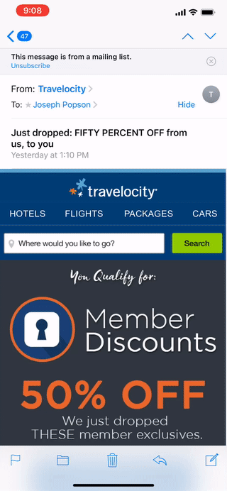 To initiate this launch the iOS Mail App and find an email that looks like a spam mailing list that you don’t want to be a part of. You’ll see the banner at the top with the option to “Unsubscribe”.